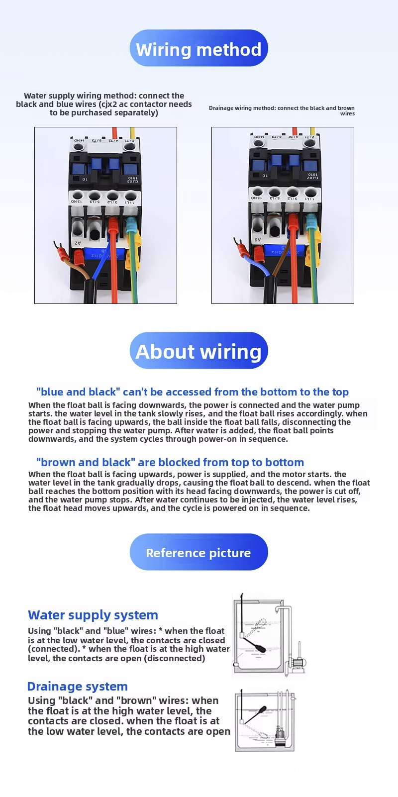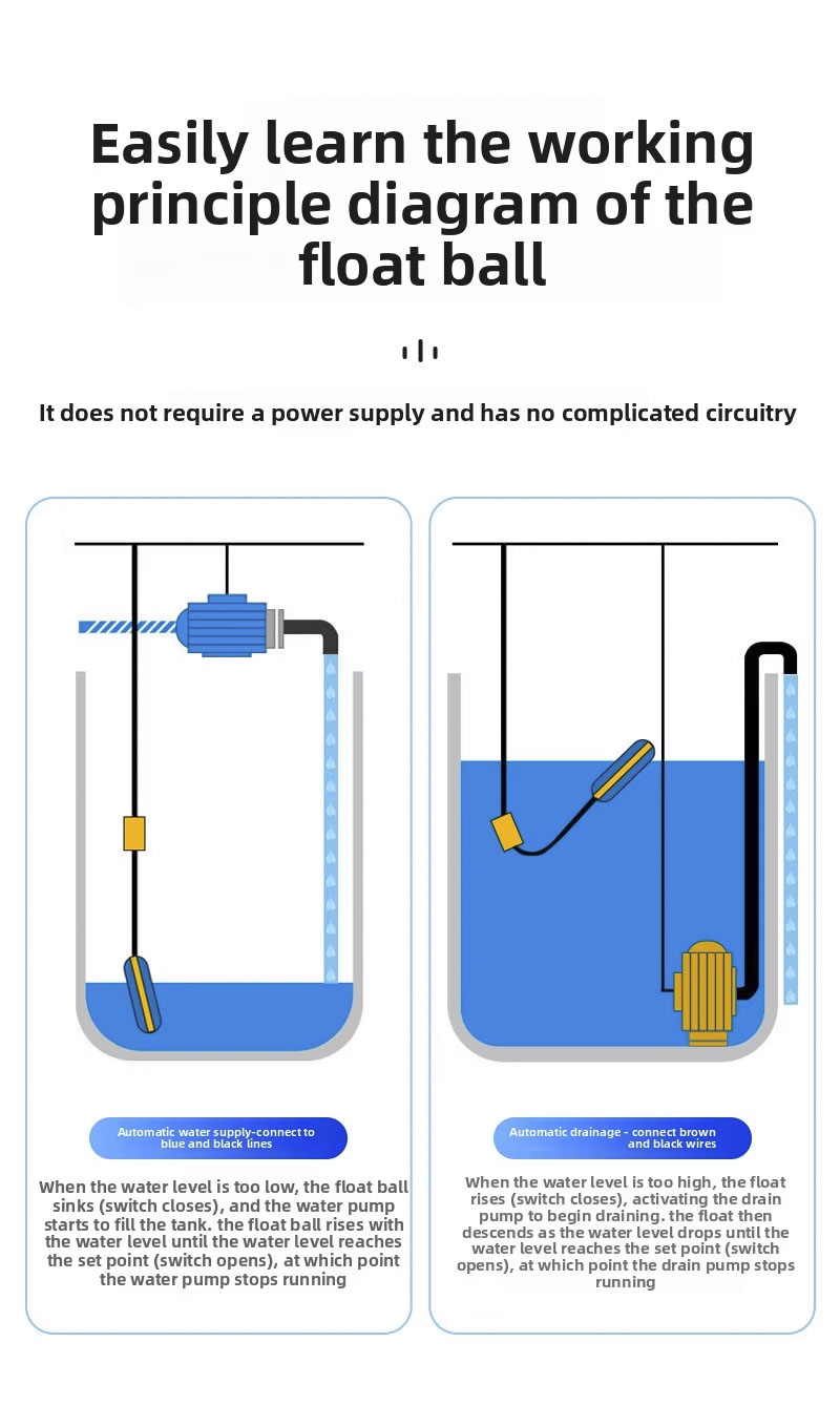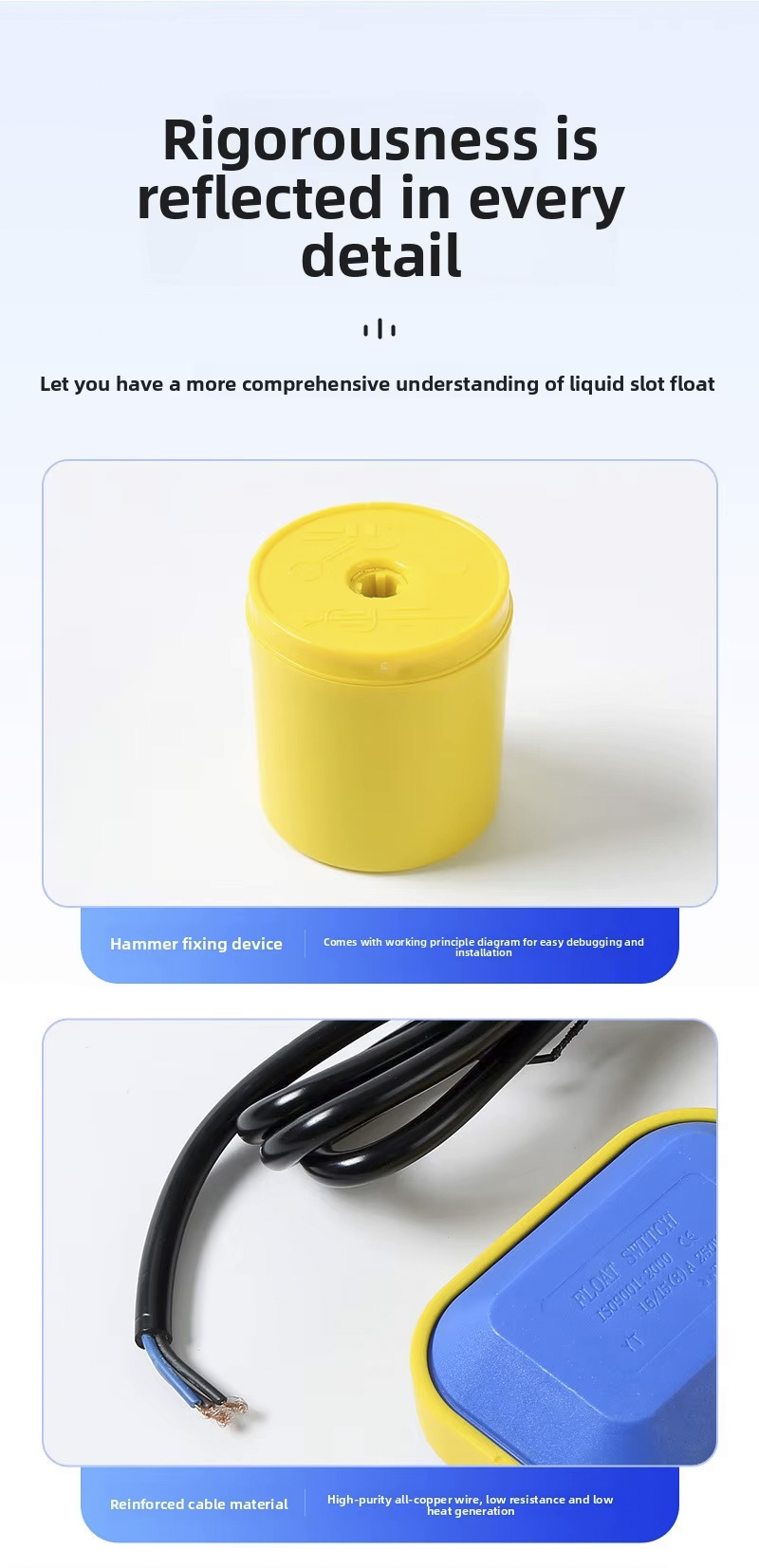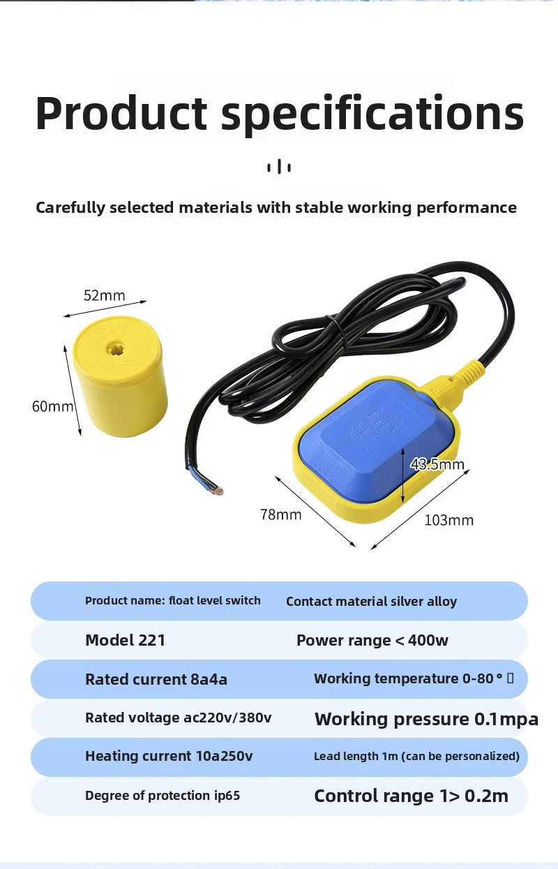 Ang float switch na ito ay nagtatampok ng malaking pabilog na disenyo na may 2m、3m,5m,10m,IP68 protection grade, at gumagana sa mga temperatura mula 0℃ hanggang 80℃,Sinusuportahan nito ang malawak na hanay ng boltahe na 110V hanggang 220V at may matatag na working pressure na ±0.5Mpa. Ang produkto ay nako-customize na may laser engraving o OEM na logo mga serbisyo, tinitiyak ang kakayahang umangkop para sa magkakaibang mga aplikasyon.