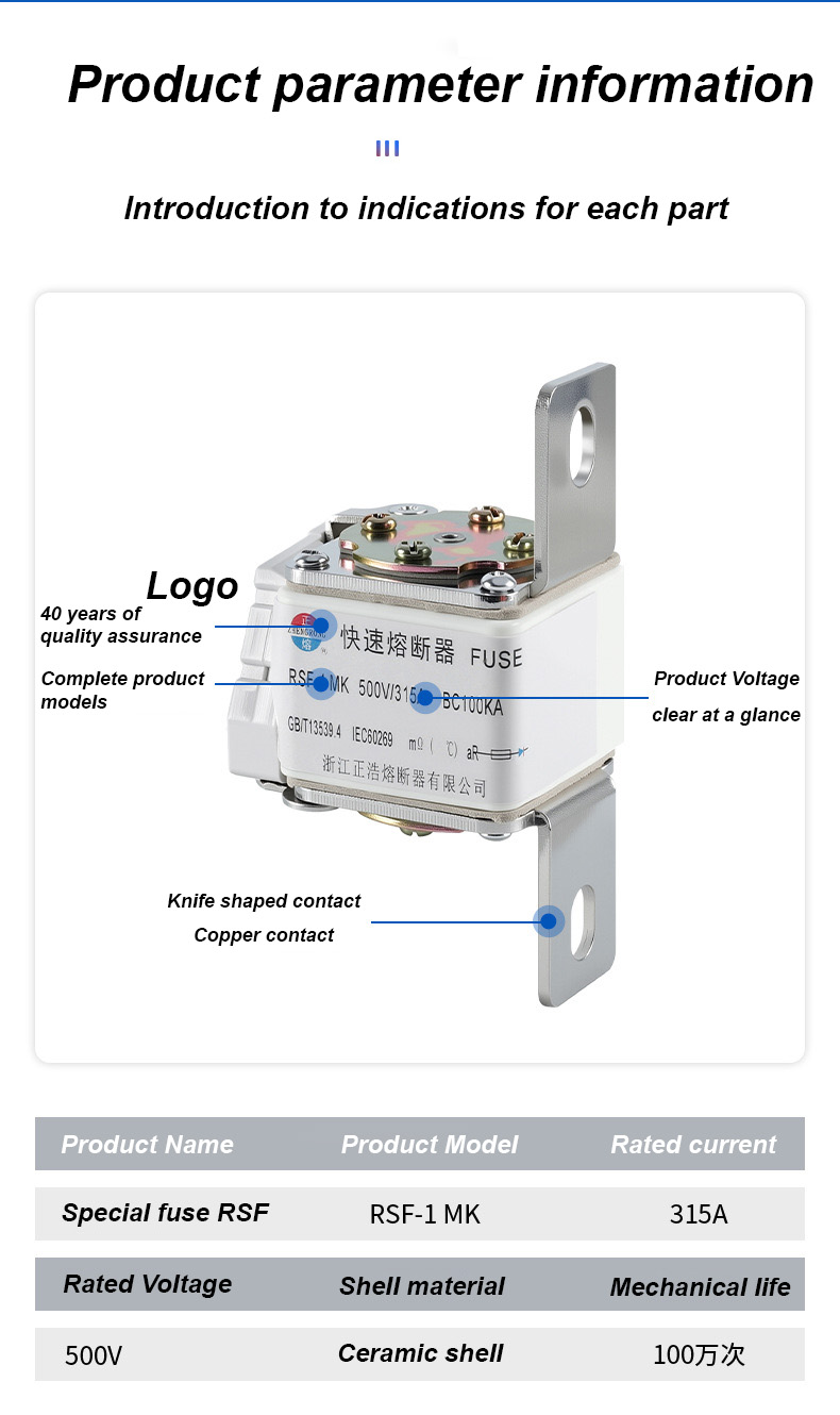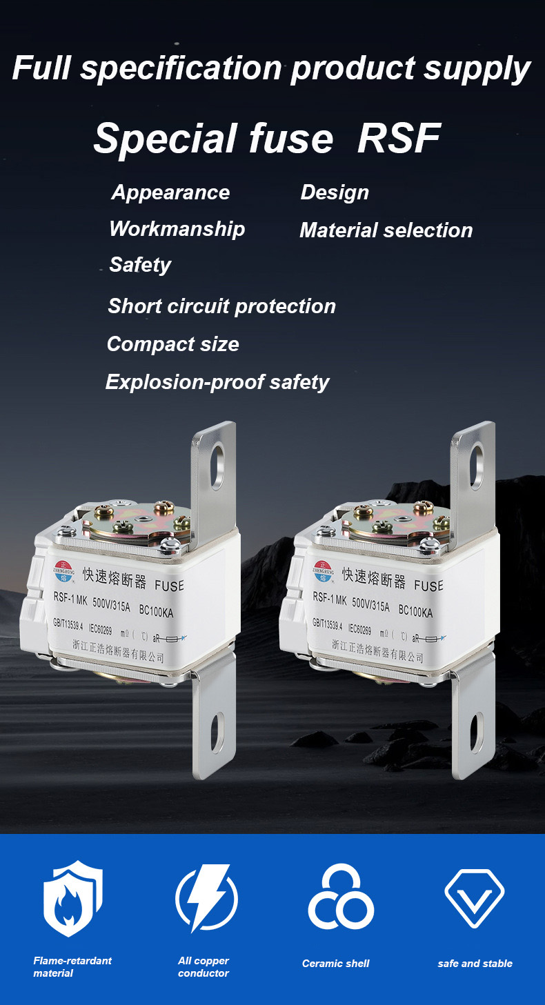 Ang RSF-1MK 500V-315A BC100KA Fuse Links ay isang high-performance na pang-industriya na circuit breaker na angkop para sa mga sitwasyong may mataas na kapangyarihan sa proteksyon ng kuryente. RSF-1K 500V-315A BC100KA fuse Links