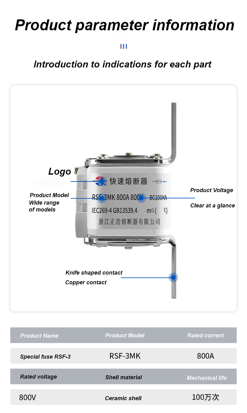 Ang RSF-3MK 800V-800A BC100KA Fuse Links ay isang high-performance na pang-industriyang circuit breaker na angkop para sa mga sitwasyong may mataas na kapangyarihan sa proteksyon ng kuryente. RSF-3MK 800V-800A BC100KA fuse Links