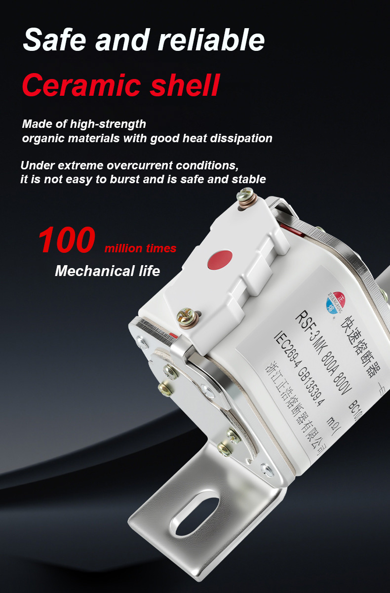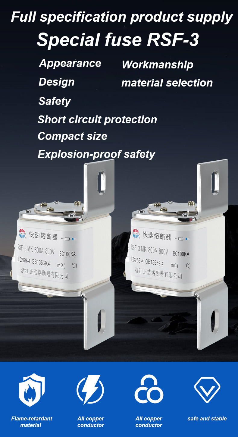 ay may naka-rate na boltahe na 500V at naka-rate na kasalukuyang 315A, na maaaring epektibong matiyak ang kaligtasan ng kuryente, maiwasan ang labis na karga at maikling circuit. Ang RSF-3MK 800V-800A BC100KA fuse Links