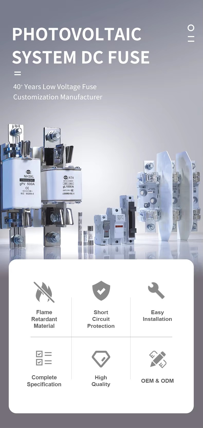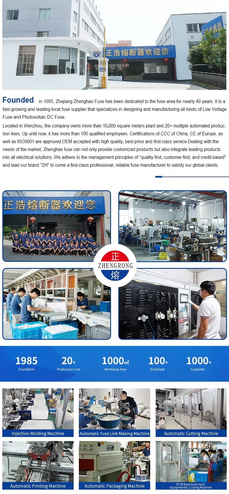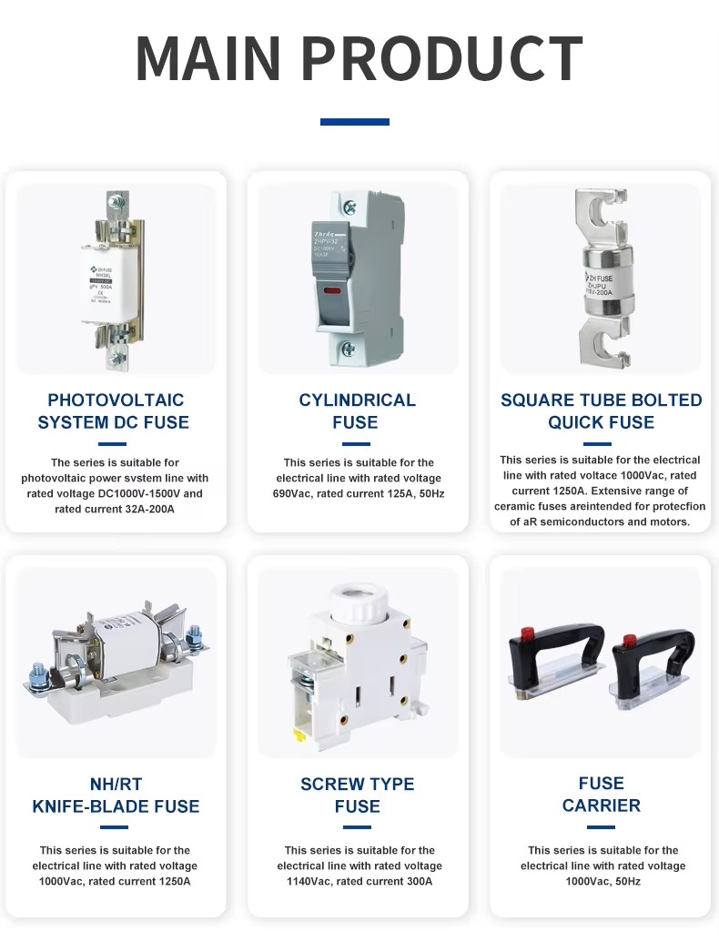 Ang mga istrukturang katangian ng ZHPV-125 1000V DC fuse base at fuse link 22 × 58mm cylindrical ceramic fuse bottom sa photovoltaic system ay ang mga sumusunod. Ang seryeng ito ng mga piyus ay binubuo ng isang fuse link at isang fuse holder. Ang variable na cross-section fuse body na gawa sa purong tanso na sheet (o tanso na kawad, pilak na kawad, pilak na sheet) ay selyadong sa isang fuse tube na gawa sa high-lakas na ceramic o epoxy glass tela na tube, na puno ng chemically na ginagamot na high-purity quartz buhangin bilang isang arc extinguishing medium. Ang dalawang panig ng fuse core ay maaasahan na konektado sa end plate sa pamamagitan ng spot welding, na bumubuo ng isang cylindrical cap na istraktura na hugis. Ang ZHPV-125 1000V DC fuse base ay gawa sa dagta o plastik na shell na pinindot ng electric shock, kabilang ang isang elemento ng fuse, na konektado sa pamamagitan ng riveting bilang isang suporta para sa naaangkop na laki ng fuse na sangkap ng katawan. Ang seryeng ito ng mga piyus ay may mga pakinabang ng maliit na dami, madaling pag -install, ligtas na paggamit, at magandang hitsura.